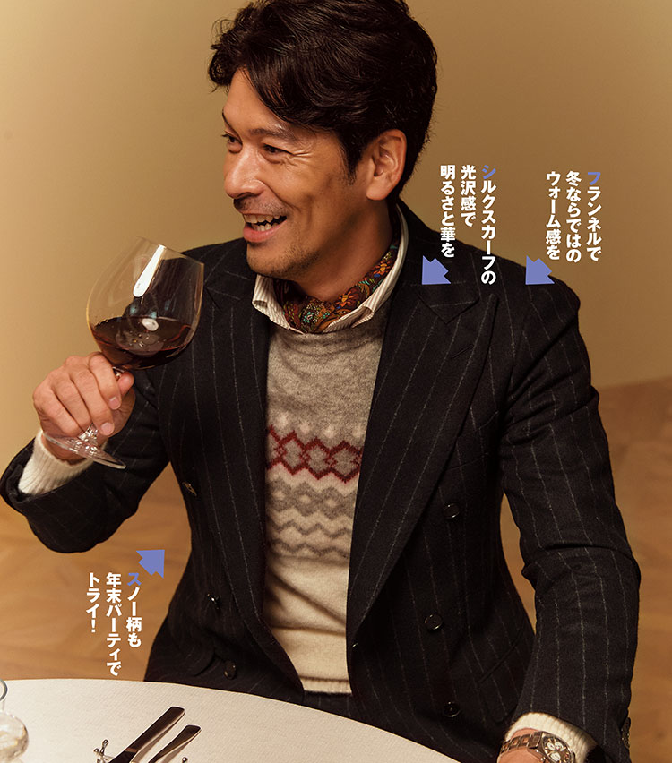 グレーフランネルの温もりと、ダブルブレストやチョークストライプ柄の貫禄が共存したスーツによる着こなし。色彩豊かな総柄がインパクト大なウールシルクスカーフは、首元にコンパクトに巻けば、悪目立ちせずに程よくエレガントなアクセントとして取り入れることができる。写真のような季節感のあるスノー柄のノルディックセーターは、チャーミングな柄行ゆえに、普段はなかなか着れないという方でも、ホリデーシーズンは是非トライを。ジャケットインすればこの時期のハッピー感をさらに高めてくれる。