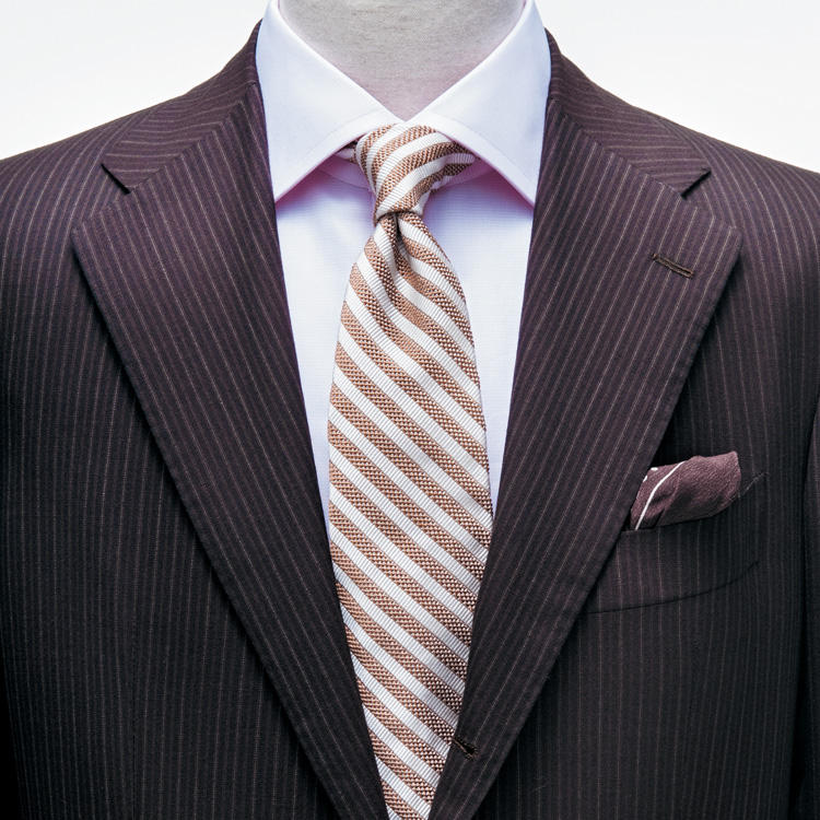 裏地なしで極力芯地を省いたスフォデラータ仕上げのタイは、ベージュ部分のガルザ織りが一層軽さを際立たせる。合わせるのは白シャツでもいいが、よりエレガントに見せたいなら、写真のような淡いピンクシャツが正解。2013年9月号掲載