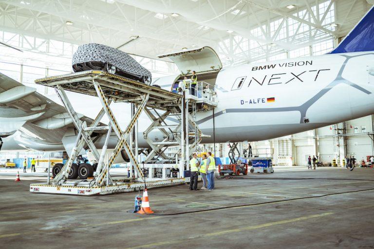 事前にカメラ類がすべて預けられ、厳重なセキュリティチェックを経て案内されたのは、サンフランシスコ国際空港の格納庫。その外に停められたルフトハンザ カーゴの機内で、「The BMW Vision iNEXT」がお披露目された。