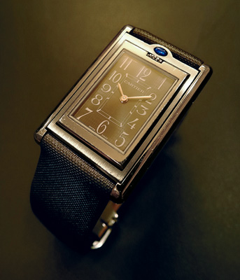 シックな黒フェイス、グレーのサテンストラップは服を選ばず、以後12年愛用中。フェイスを回転すると鏡になっているのもお気に入り。