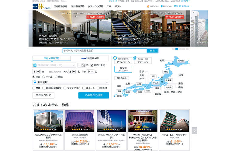 高級ホテルや旅館の宿泊予約サイトというイメージが強い「一休.com」だが、最近ではワンランク上のビジネスホテルにも力を入れ、旅行・出張の両方で活用することが可能。会員限定プランやタイムセール、ポイントの即時利用などが充実し、使えば使うほどお得に利用できる。また各ホテルの紹介画面も写真を多く使うなど、見やすい工夫がされ、楽しくホテル選びができる。
