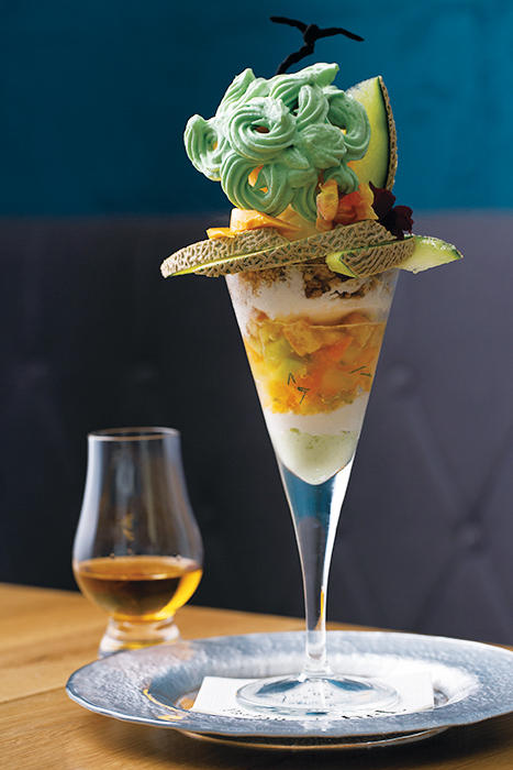 「パフェテリアベル」で男性におすすめなのは、ほどよくさっぱりとしたメロンとパパイヤパフェ。下からメロンムース、ヨーグルトムース、メロンとパパイヤなどのマチェドニア、パルメザンのシュトロイゼル、ヨーグルトジェラート、メロン、ソフトクリーム、上にはメロン色のメレンゲを。1700円