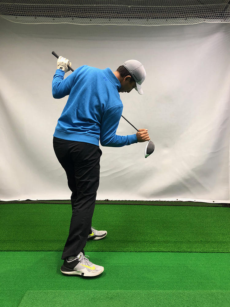 プッシュスライスに悩む人の多くが、あおり打ちによる極端なインサイドアウト軌道になっています。こうなってしまうのは、インパクトでカラダが起き上がって前傾角度がなくなってしまうからです。