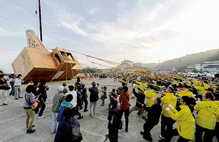 倒壊した家の解体作業を手伝ったアーティストと家主たちとの交流から生まれた作品。被災した地域のシンボル、灯台を修理し、総勢500人の力で「引き興し」された瞬間、複雑な住民の気持ちが緩くつながっていく。