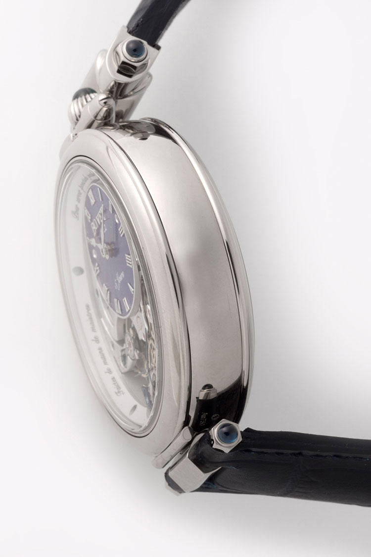 オフセットダイヤルの下側に、主要な歯車とテンプとがシンメトリーな配置で姿を見せる。トゥールビヨンを持たない初の自社製ムーブメント搭載モデルの、これは新色。オフセットダイヤルは、鮮やかなブルーギョーシェに仕立て直された。ケースの反転、取り外しが可能なボヴェ独自のアマデオコンバーチブルシステムを採用。ケースを裏返すと表れる、レトログラードミニッツとジャンピングアワーとを組み合わせて機構にも凝った第2のダイヤルも同じブルーギョーシェ仕上げでコーディネートされている。
