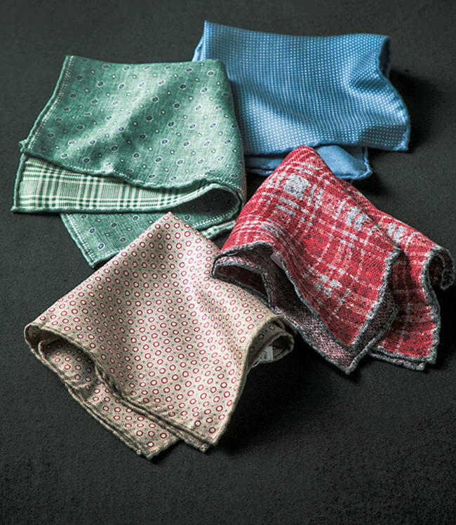 ニュアンスに富んだ色柄、クチネリ品質のしなやかさがあるチーフは、一挿しするだけで格上げに貢献。「美しい生地と上品な柄が傑作たる理由。両面使い分けるもよし。柄をミックスしても表情豊かです」(モデル デビッドさん)各2万円(ブルネロ クチネリ ジャパン)