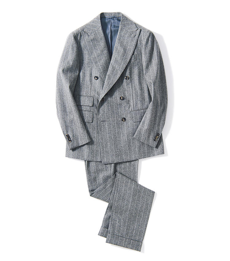 グレーフランネル地のチョークストライプが余裕と貫禄たっぷりな印象。幅が広く、大きくカーブしたラペルはスティレ ラティーノのダブルに特徴的な仕立てだ。パンツはピストル型のサイドアジャスターが付いた1プリーツ。29万5000円(ビームス ハウス 丸の内)