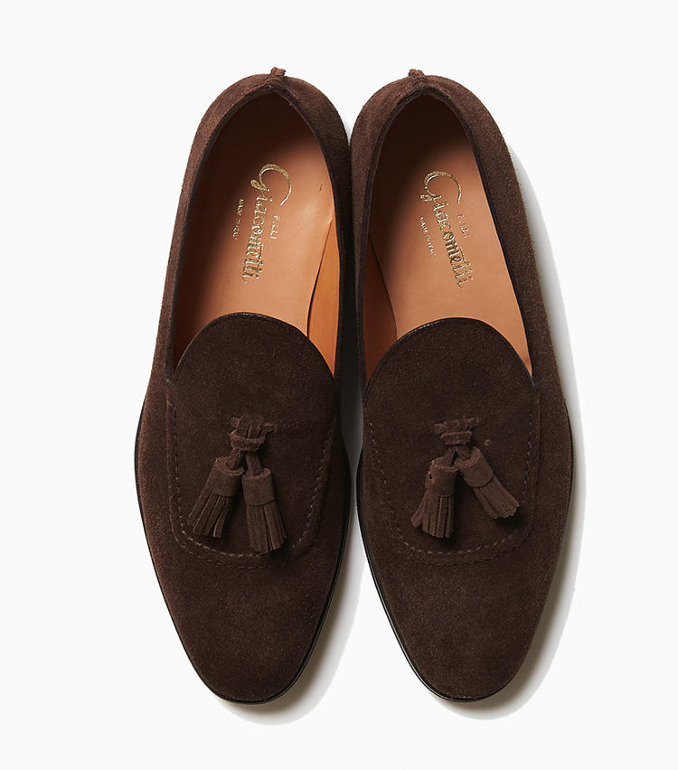 「トラッドアイテムのダッフルですから、やはりトラッドなジャケパンがよく合います。ここでは紺ジャケ、グレーパンツ、ストライプタイと、王道のトラッドを意識しました。また、ダッフルはラグジュアリーなムートン素材を選ぶことで、大人の格を表現しています。ムートンは保温性にも大変優れているので、寒さが厳しくなってくる時季の通勤や外回りにもおすすめですね。足元はタッセルローファーを合わせて、トラッドを意識しつつコインローファーよりも大人っぽい雰囲気にまとめました」(ラ ガゼッタ 1987 プレス 佐々木皓哉さん)
