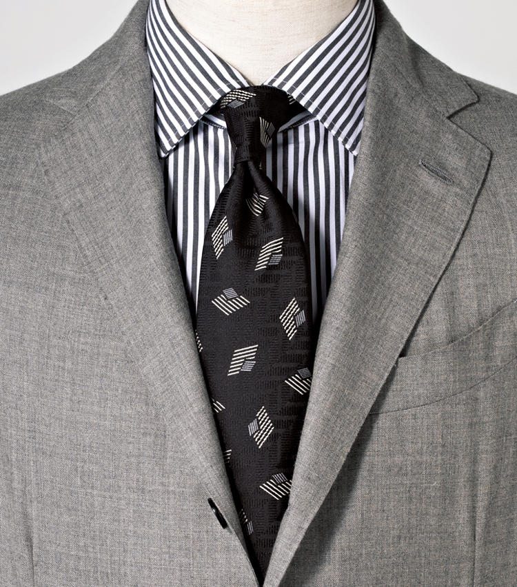 幾何学柄タイが持つ鋭い印象を、ストイックに引き締めてより際立たせるモノトーンの色使いだ。