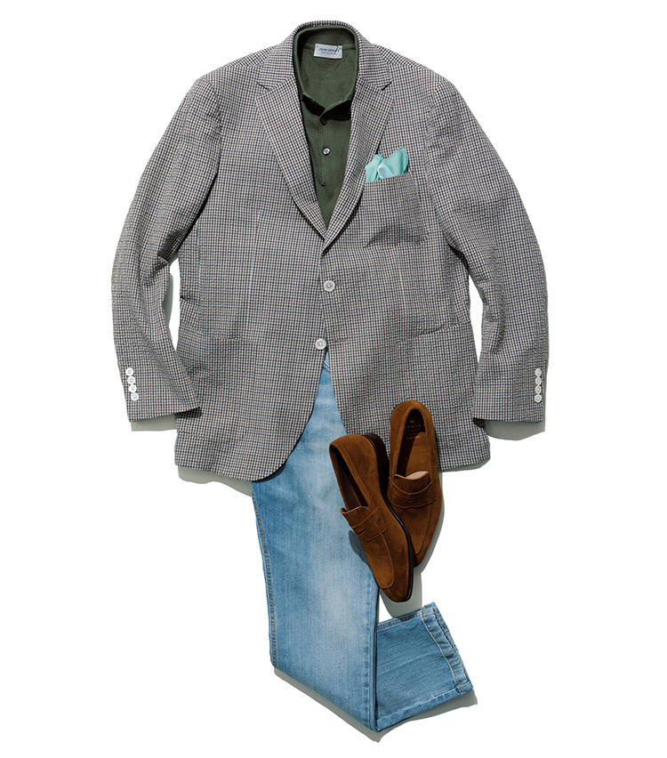ブリーチ×サンドブラストを施しながら、スリムテーパードシルエットが品良いデニム。ジャケットは細かなガンクラブチェックを選び、ポロシャツのラフな雰囲気に沿いつつも主張を抑えめに。落ち着いた色のトーンも◎。