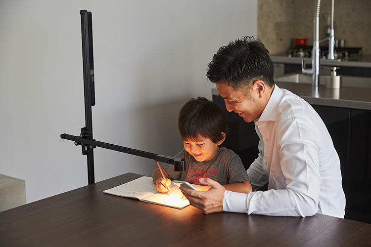 「実はこの家、蛍光灯がないんです。照明はすべてダウンライトにしました。個人的には、蛍光灯の光は明るすぎると思うのです。とはいえ、細かい文字を見るときなどはより視認性を高める光が便利なこともある。というわけで、Lightcycleのフロアライトは重宝しますね。光の色みを変えられるので、普段はダウンライトと同じ暖色系の色に設定し、必要に応じて白い光で手元を照らすこともできますから。たとえば子どもに勉強を教えるときなどには白い光が便利だと思います」