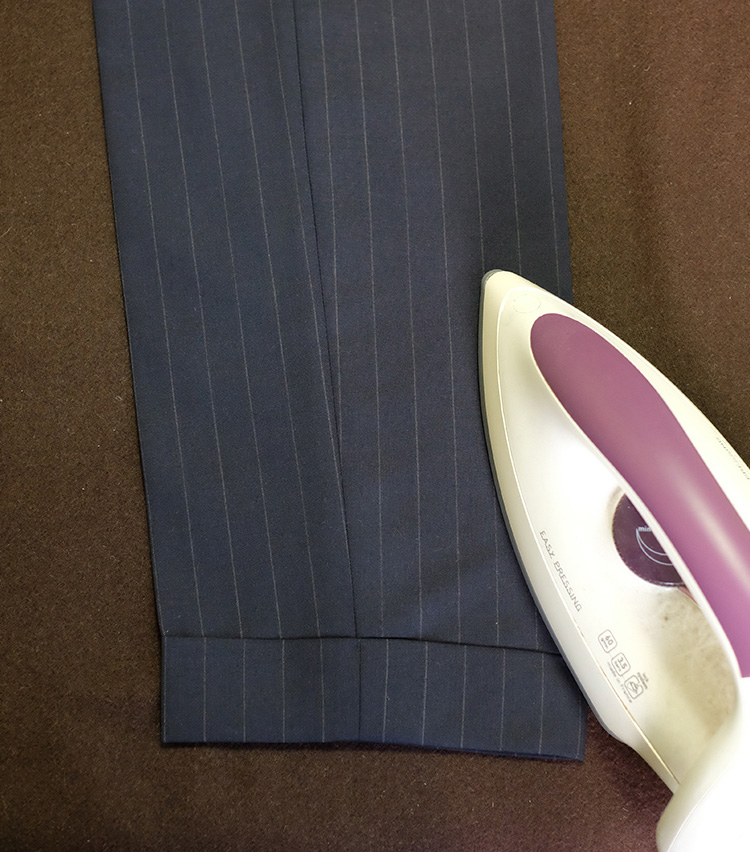 上質なストライプパンツの場合、プレスのラインはストライプに沿って入れられているものが多い。薄くなったプレス跡に加えて、ストライプの線沿いにアイロンをかけるようにすると失敗がない。