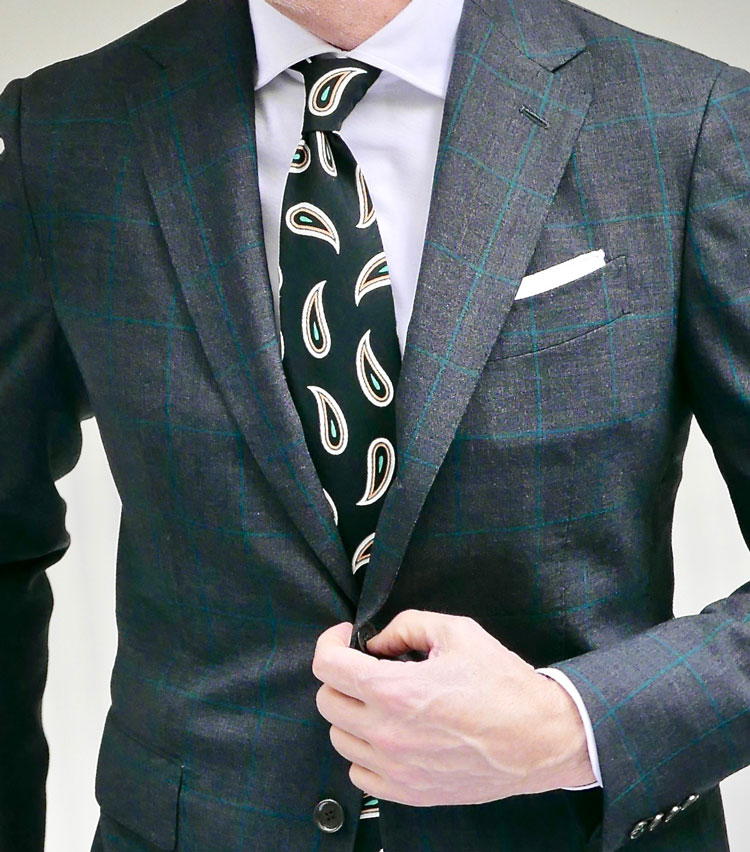 遠目無地に見えるグリーンのペーンが入ったグレースーツ。ソリッドなブロードの白シャツに、黒ベースのビッグペイズリータイで時には大胆な男を演出する。スーツに走るペーンのグリーンを、ペイズリータイのグリーンで拾うあたりに、スーツを着慣れた男のさりげない上級者テクを垣間見た。