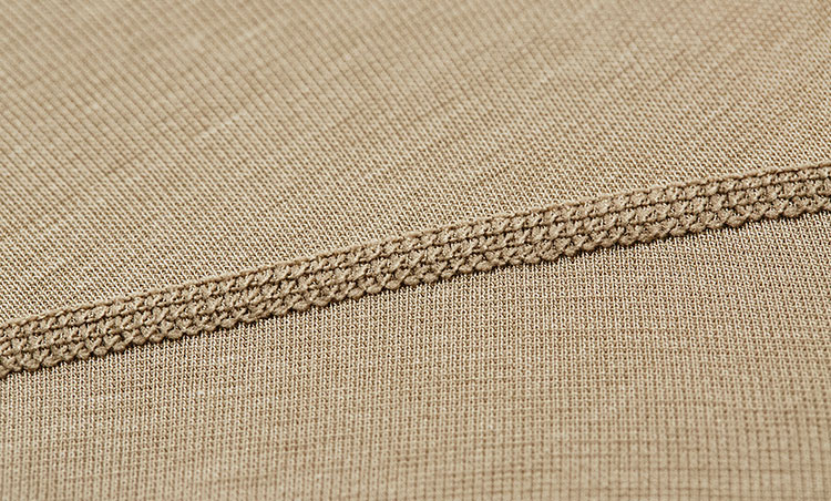襟ぐりや裾口、裾は、裁断しながら特殊な技術でほつれ止めを施したカットオフ仕様。エッジがフラットになるため表に響きにくい。