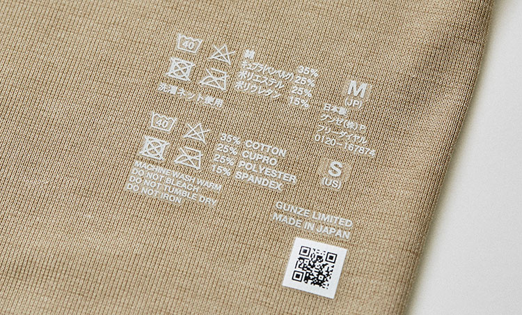 洗濯表示等のタグは脇に縫い付けられるのが一般的だが、SEEKではこれをプリントで表示。肌あたりのよさを徹底的に追求している。