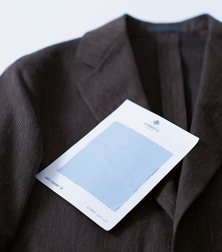 中でも本誌が推したいのは色柄生地でのオーダー。タイがないぶん、いつもより少し華やかなものが適度なバランスなのだ。もちろん、リネンなど夏素材を選ぶのもよい。