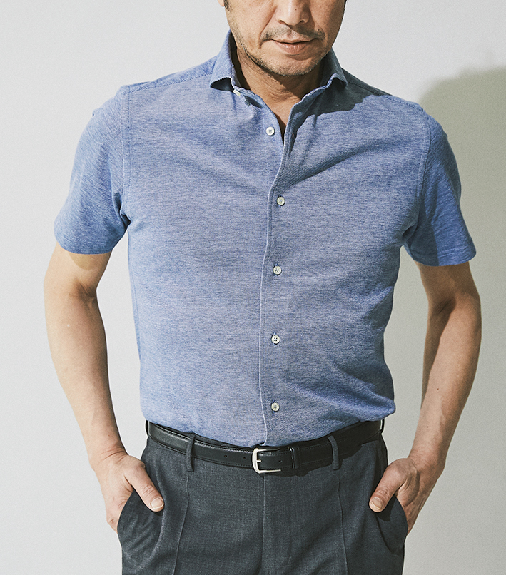 ハリがあって透けにくく、UVカット機能も備える高機能素材のジャージーシャツ。ハニカムメッシュ状の組織に編み上げてドライな肌触りと高い通気性を実現した。暑苦しい黒のイメージと裏腹、盛夏も快適にしのげる。綿55%+ポリエステル45%。1万円〈オーダー価格〉(Y&Mプレスルーム)