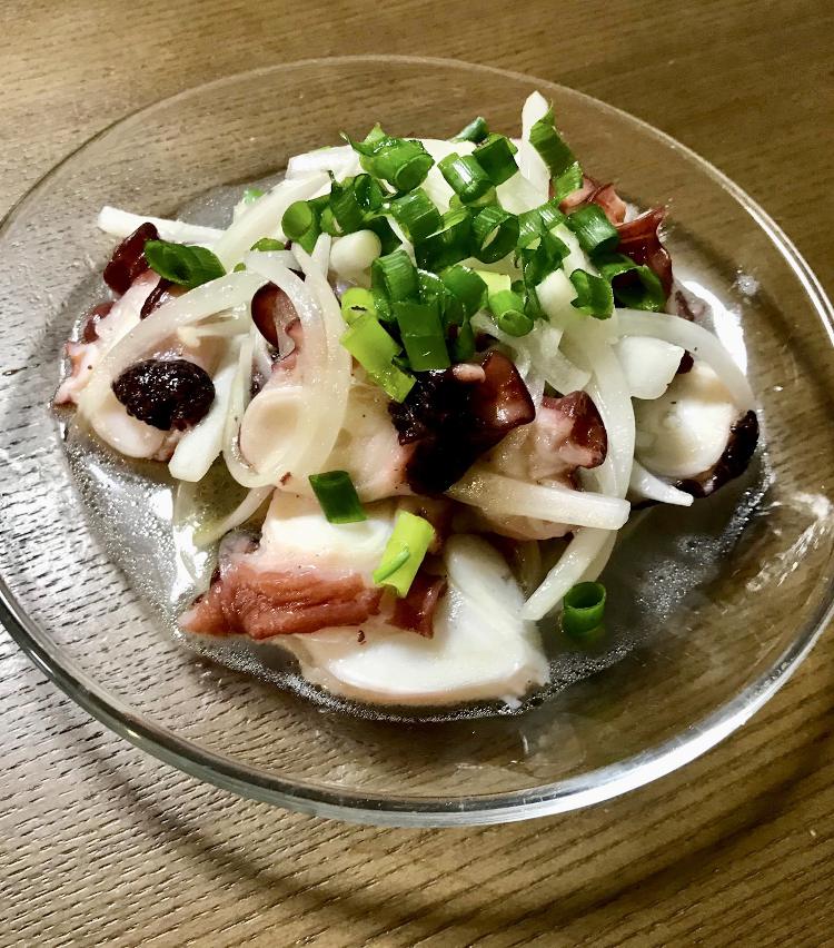タコはそぎ切りに、玉ねぎは千切りにして水にさらす。