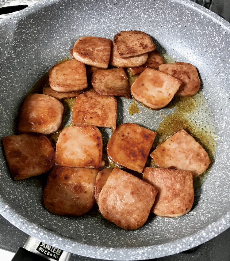 3.フライパンに油をひかず、スパムを並べて弱火で炒める。