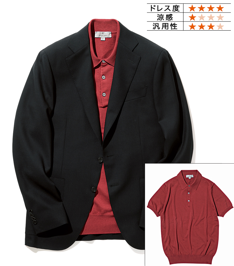梳毛の上品なウールジャケットには、上質なハイゲージのニットポロでドレッシーに。グレーウールのスラックスを合わせれば、落ちついた大人の印象に仕上がる。ドレス度が高い着こなしの時こそ、あえて華やかな色が効く。ビビッドな赤ではなく、熟成したワインのような落ち着いた渋みのあるボルドーを選ぶのがポイントになる。裾が広がりにくいリブ編みも上品さの決め手。ジャケット17万円、ポロシャツ2万7000円(以上コロネット)