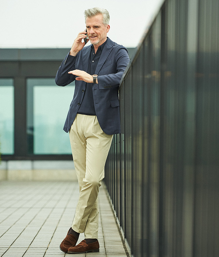 薄手のウェザーウーステッドウール生地とアンコン仕立てが相まって、実に軽快な着心地に。ネイビーとブルーの糸が混色した色合いは、ビジネス顔一辺倒にならず休日使いにも◎。5万9000円(SANYO SHOKAI TEL:0120-340-460)
