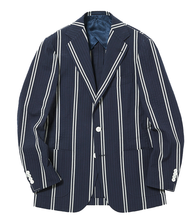 太縞のレガッタストライプがカレッジテイスト満点のジャケット。ウール混のサッカー素材を使用した軽量設計のため、見た目端正で着心地ラクチン。仕事中の冷房避けやリゾートの羽織りとしても活躍する。8万5000円(リングヂャケットマイスター206 青山店)