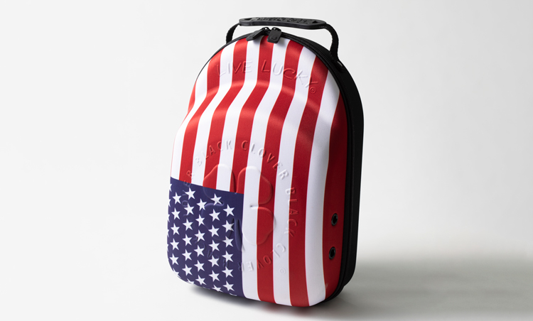 旅先でのラウンドはもちろん、自宅の保管用としても便利なキャップとサングラスの収納ケースは、軽量で衝撃に強いEVA素材を採用。存在感のある星条旗プリントに、よつ葉のクローバーや「Live Lucky」のロゴの型押しをあしらったデザインが目を引く。キャップが4~5個収納可能、両開きのファスナーやサイドの空気穴、持ちやすいグリップなど、自慢のキャップを型崩れせずに持ち運べる。ハットキャディ7400円/ブラッククローバー(FDRカスタマーサービス)