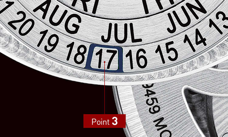 リューズ操作で“戻せる”円形表示の永久カレンダー