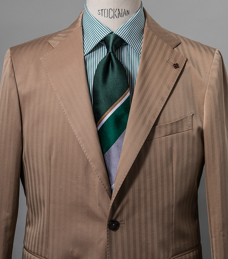 グリーンとベージュの相性の良さを生かしたコーデ。それでいてマルチカラーの変則ストライプが胸元に独特のリズムをつけているのもいい。スーツ12万5000円/タリアトーレ(トレメッツォ) シャツ1万3000円〈オーダー価格〉/麻布テーラー(Y&Mプレスルーム) ※タイは上の画像[右]と同じ。
