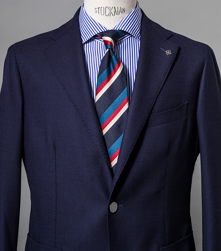 タイのネイビーとブルーを拾ってジャケットとシャツをコーディネーション。これでボトムスを白やベージュのパンツとすれば一気にフレンチテイストが高まるだろう。ジャケット8万6000円/タリアトーレ、シャツ2万4000円/バグッタ(以上トレメッツォ) ※タイは上の画像[左]と同じ。