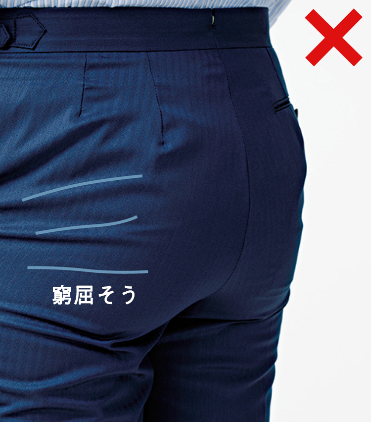 お尻まわりや腰骨の下がタイトすぎると生地が突っ張り、ポケット口が開いてしまう。不格好なので避けたいところ。