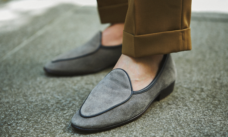 <p>足元はグレースエードのボードイン&ランジを素足履きして軽やかさUP。</p>