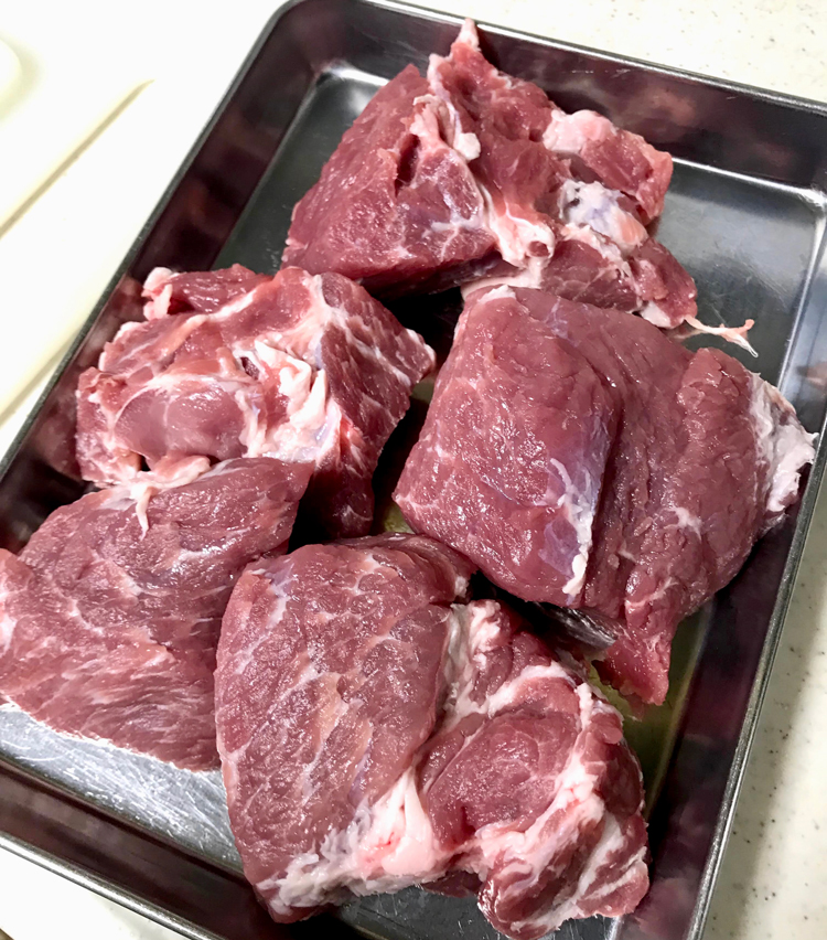 4. 一晩置いた豚肉は水気を拭いて、大きめにカットする。