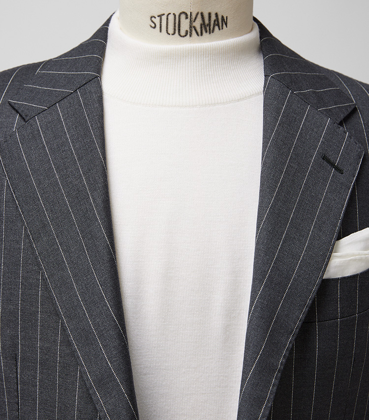 タイドアップすれば威厳溢れるスタイルが築ける幅広ストライプのスーツ。そのインを白のモックネックにすることで、ぐっと柔和な雰囲気になる。内勤のときにおすすめしたい。スーツ6万6000円〈オーダー価格〉/麻布テーラー(Y&Mプレスルーム) チーフ〈スタイリスト私物〉