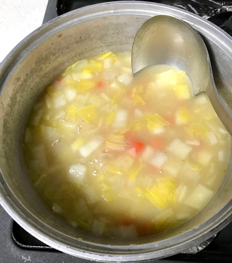 7. 水500mlと先ほどの牡蠣の煮汁を入れ、コンソメキューブ1個で味付けし、野菜が柔らかくなるまで10分くらい煮る。