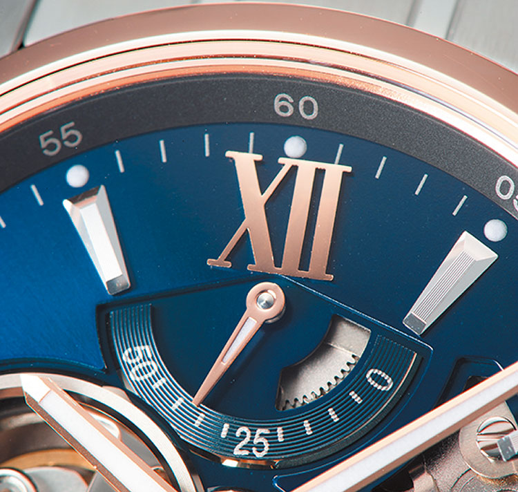 本作では“夜明けの海辺”をモチーフとする新しいデザインを採用。太陽が昇った直後の海と空の美しい光景をイメージし、センターのグリーンから外側のネイビーへと変化するグラデーション仕様の文字盤に、太陽の光を思わせるピンクゴールドカラーの針と12時のインデックスを配して、やはりピンクゴールドカラーのベゼルで囲い込んだ。また、古典的なフルスケルトンではないものの、心臓部のテンプの動きが見渡せる9時位置や12時位置のパワーリザーブ表示内など、いたるところにオープンワークを取り入れて、内部システムをチラ見せするモダンなスケルトンデザインに仕上げている。
