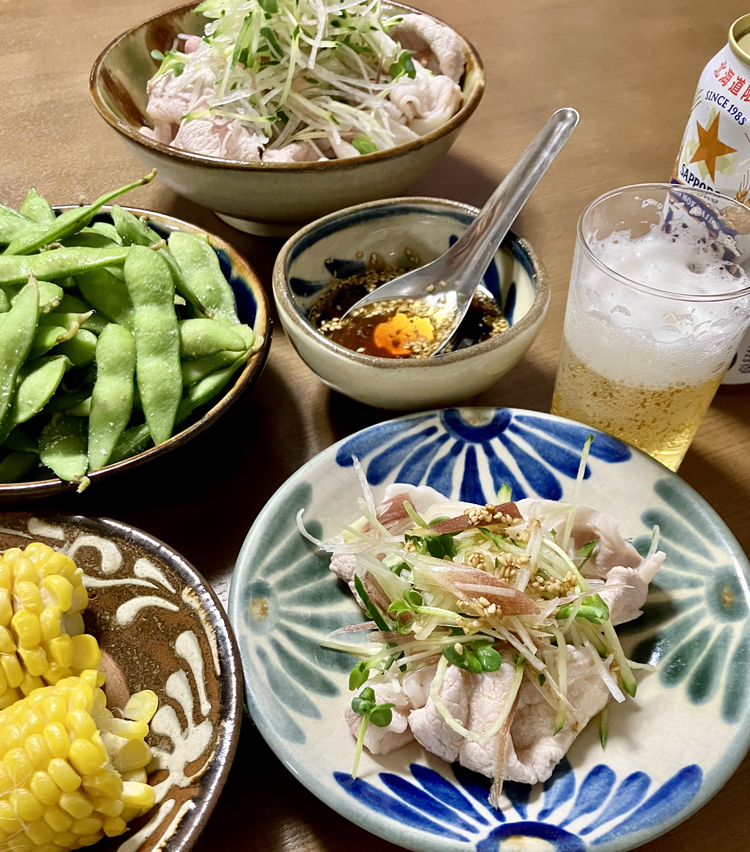 9. 野菜の水気をしっかり切り、豚肉と一緒に皿に盛り完成。タレをかけてどうぞ。薬味を合わせるとさっぱりと食べられる。