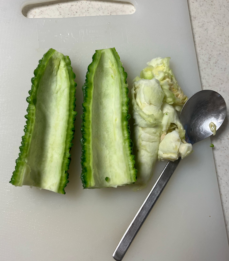 2. ゴーヤは縦に切り、スプーンで綿を取り除く。
