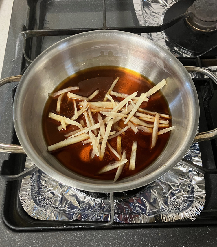4. 鍋に醤油みりん各大さじ2、酒大さじ1、砂糖大さじ1、生姜を入れ中弱火にかける。