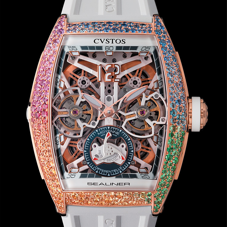 並列ツインバレルは、近年設計されたキャリバーでは定石となりつつある。クストスでは大きな出力を必要とするダブルトゥールビヨンを動かすために並列の4バレルを採用。世界初にして特許を取得し、ハイビートなダブルトゥールビヨンをより正確に動かす。