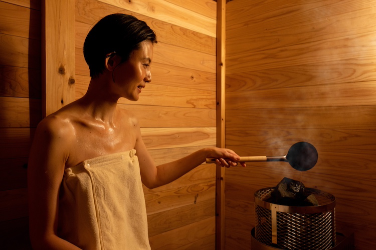 本プログラムではテラスに中温高湿のサウナが設置された特別な客室を用意。サウナは熱と蒸気によって体を深部から温める「ウェットサウナ」方式で、高湿の水蒸気を発生させる「ロウリュ」も可能。