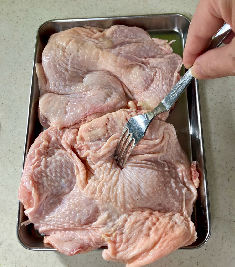 1. 鶏のもも肉は水分を拭き、余分な脂肪や筋を取り除き、厚みのある部分を包丁で開く。