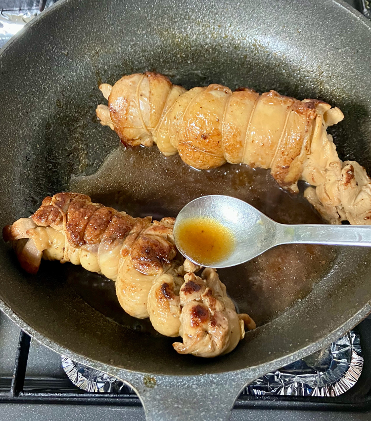 4. 鶏肉を取り出し、皮の面を表にして巻き、タコ糸で縛る。