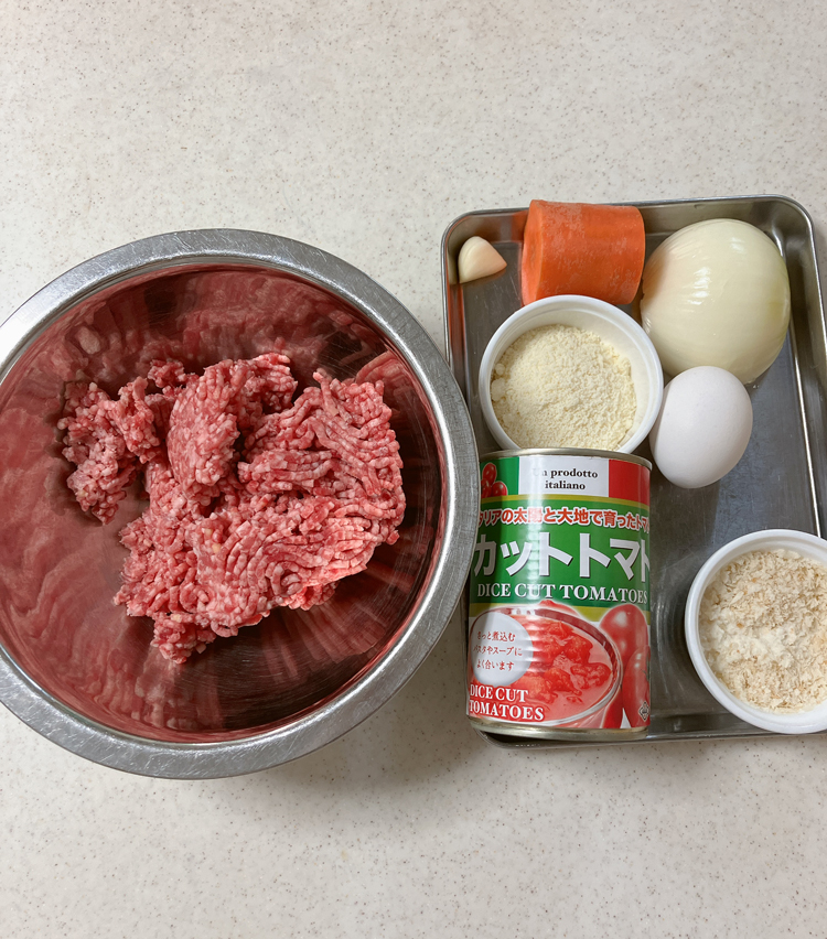 3. 牛肉に、塩小さじ1/2、牛乳でふやかしたパン粉、卵、粉チーズ、胡椒少々、ナツメグ少々を入れる。