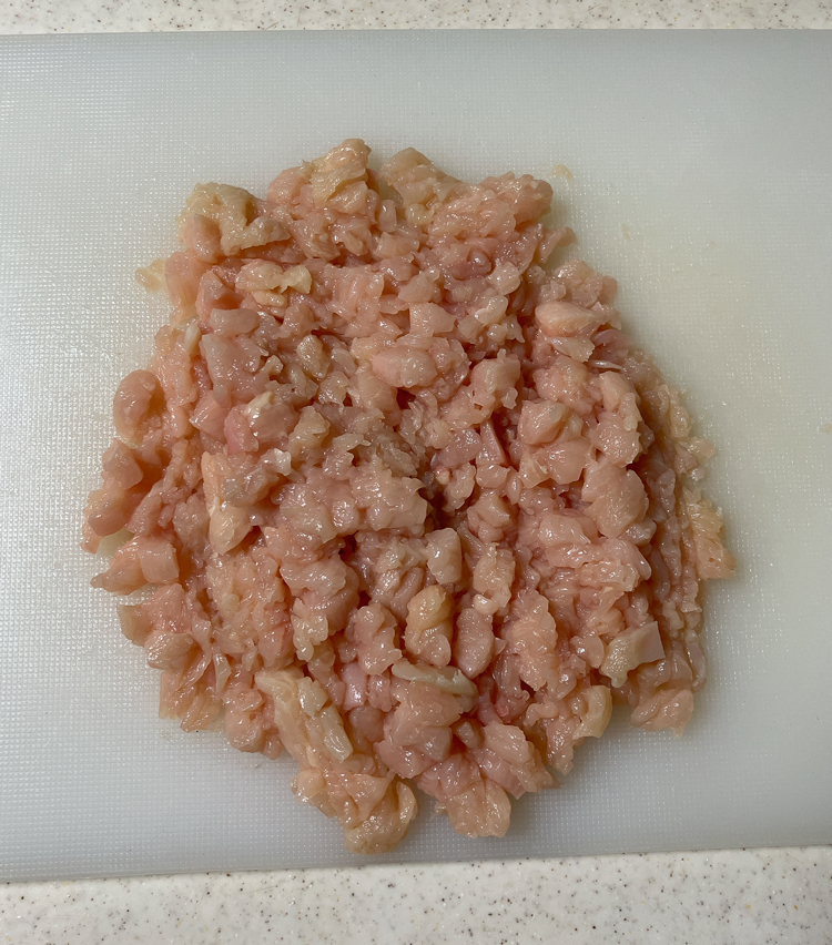 2. 鳥むね肉は皮を剥き、細く切ってから細かく刻む。