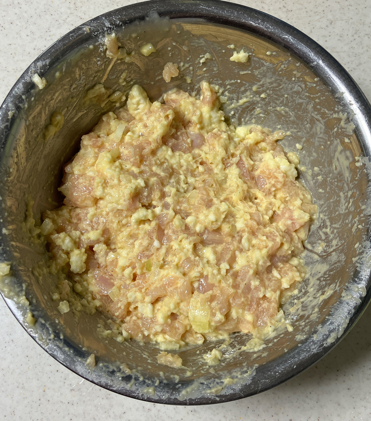 3. 玉ねぎはみじん切りにする。ボールに鳥肉、玉ねぎ、卵、マヨネーズ大さじ1.5、片栗粉大さじ2、顆粒コンソメ小さじ1、胡椒少々を入れよく混ぜる。