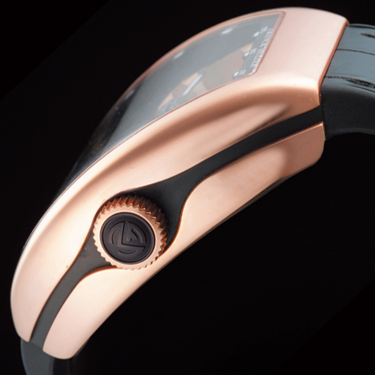 他のヴァンガードシリーズ同様、本作もストラップの取り付け位置を隠すことでケースとの一体化を実現。ラグのない大型の一体型ケースが、ダイナミックかつアヴァンギャルドなトノウ形状を際立てる。またスケルトンデザインでは、ムーブメントプレートを極限まで削り、必要最小限のフレームだけを残した。これにより約5日間パワーリザーブを誇るツインバレルも表側から見ることが可能に。内部機構だけでなく、デザインまでグラビティ=重力というテーマを追求し、繊細なコンプリケーションを“魅せる”モデルへと進化させた。