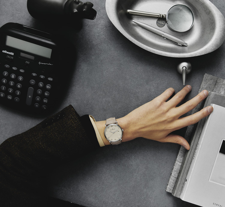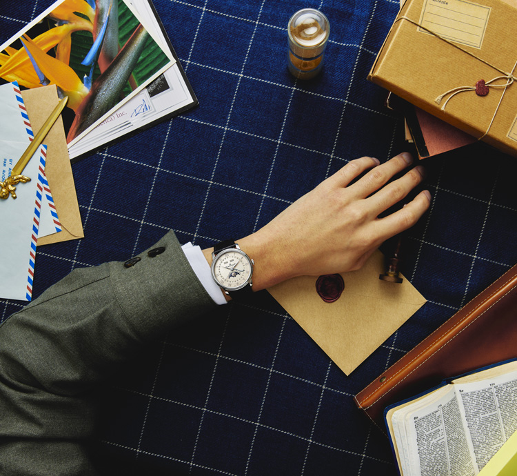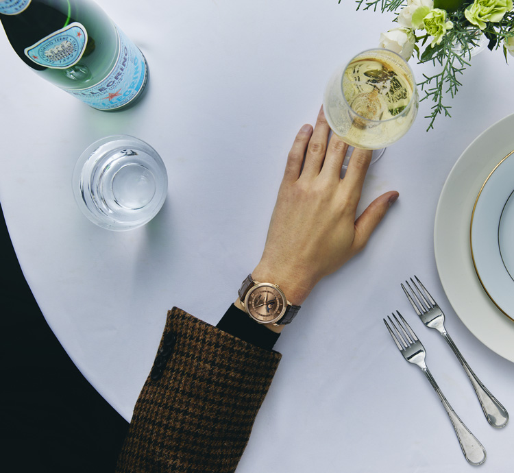 18Kレッドゴールドケースにブラウン文字盤をあしらった「ヴィルレ コンプリートカレンダー」は、新作コレクションのなかでも抜群のラグジュアリー感を放つ一本。暖色系のケースとダイヤルがグラデーションのように一体となりつつ、際立つ煌めきを手元で放つ。それでいて、径40㎜の薄型ケースによる知的な品格もあわせもっているところが醍醐味だ。もちろんビジネスシーンで活用するのにもぴったりだが、たとえば格式あるレストランで、シャンパーニュとフルコースに興じる一夜にも絶好。心地よい緊張感を味わいながら楽しむ日常の一歩外を、一段と豊かに彩ってくれるだろう。