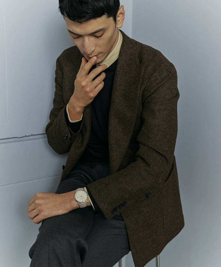 さてここからは、新作「ヴィルレ」コレクションから4本をピックアップして、そのスタイリング例をご紹介したい。まずは最もシンプルなSSケースの「ヴィルレ ウルトラスリム」。タイドアップしたクラシックスーツにマッチするのはいわずもがなだが、実はノータイのビジネスカジュアルにもよく映える。要因は、控えめでありながら柔和さも備えた顔つきだろう。40mmという適度なケース径、さりげなくアクセントの効いた夜光針、そしてうっすらベージュのニュアンスを帯びたオパリンダイヤル。ドレッシーでありながら洒脱さも漂わせる絶妙な顔つきが、今どきのリラックス感あるビジネススタイルにいっそうの洗練を与えるのだ。