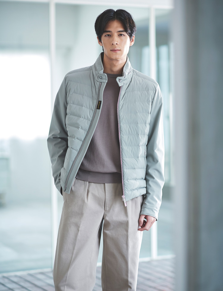 イタリア・ヴェローナで創業した〈ムーレー〉は、高品質なダウンジャケットで知られるラグジュアリーアウターブランド。選びたいのは、寒暖差のある時季に活躍するバイカースタイルのショート丈だ。グースフェザーによる軽快な着心地と、十分な保温性を両立している。